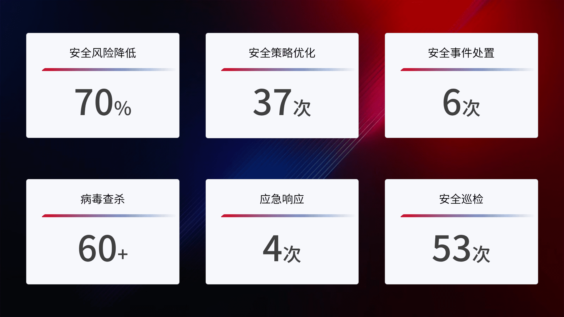 提供全面的安全事件报告体系,,,包括处置报告、、、、周报、、、季度和年度总结,,,结合持续监控,,,,帮助客户深入了解网络安全状况。。