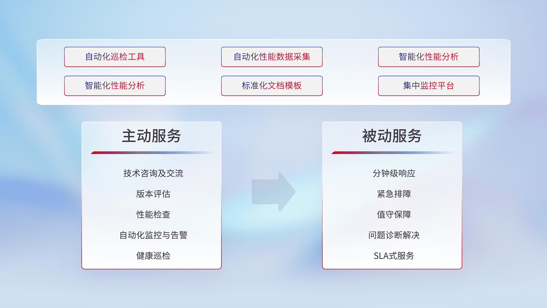 智能化工具和标准化文档,,保障服务质量,,,,提供主动服务(包含技术咨询、、版本评估、、、性能检查、、自动化监控与告警、、、健康巡检)和被动服务包含(分钟级响应、、紧急排障、、、值守保障、、问题诊断解决、、、SLA服务)。。。。